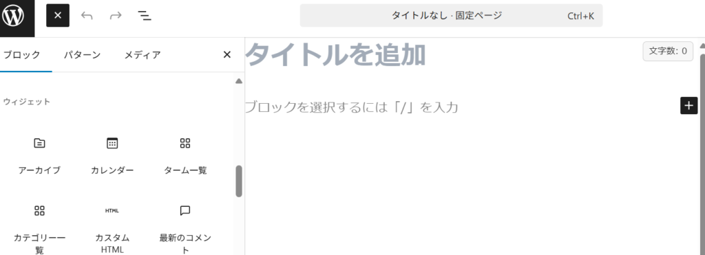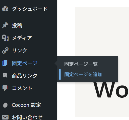 まずはwordpressの画面から「固定ページを追加」を選択。