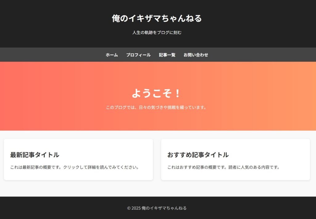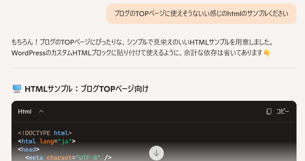 初心者の方はAIに「ブログのTOPページに使えそうないい感じのhtmlのサンプルください」なんて言えばすぐに作ってくれるので、それを張り付ければOKです!後から修正できますので。