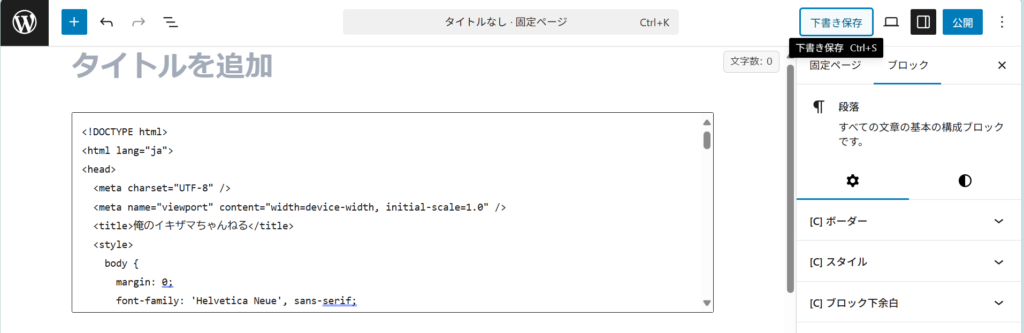 下記のように、HTMLを張り付けたら右上の公開ボタンで公開します。インターネット上に公開されますが、このページへ遷移するリンクが存在しないので誰かに見られる可能性はとても低いです。