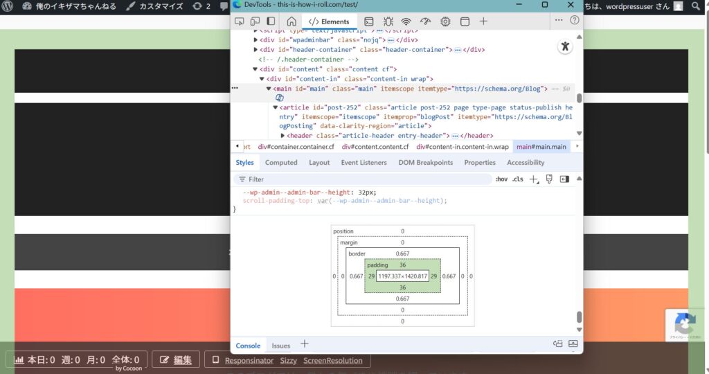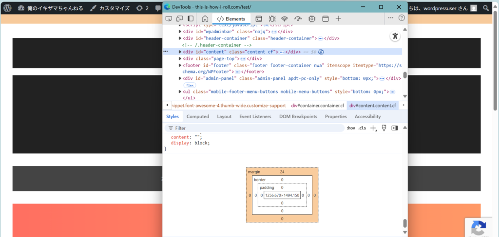 私の例ですと、contentクラスのmargin、mainクラスのpaddingを消せばよいことがわかります。オレンジの枠のクラスについて「content cf」とありますが、これは、「content」でも「cf」でもどちらでも使ってOKという意味です。ただ、他に同じクラスの名前がある場合はその要素にも同じ変更がされてしまうので、ご注意ください。