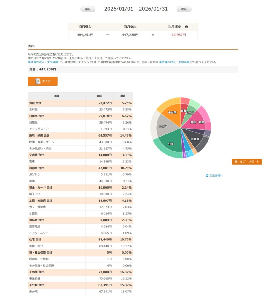下記は1月中の私の支出をマネーフォワードで取得した結果です