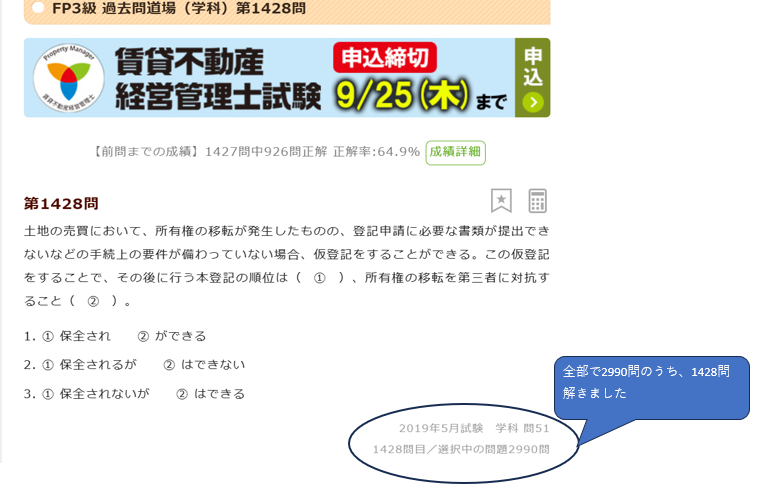 私はこのサイトで過去問を1400問ほど解きました。十分すぎるくらい解いたので、合格ラインに行くにはもっと少ない時間でも可能かと思います。