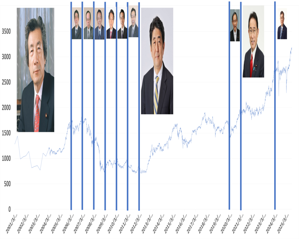 以下は、TOPIXと各総理大臣の任期を組み合わせたものです。