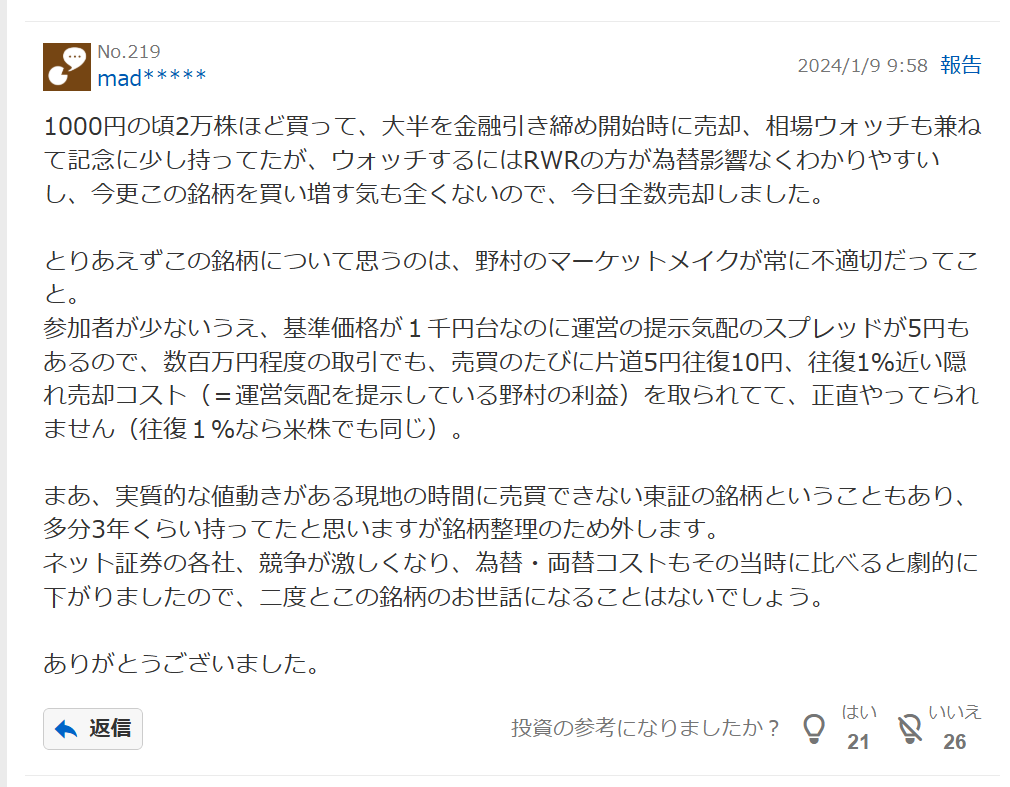 私は長期投資前提なので、この問題は特に気にしなくてもよいかと思いました。しかし、ショートトレーディングをする人にとっては致命的ですね。。。成行で買わないで、指値で買うことでこのコストは無視できますが、自分の納得する価格で買うことが難しくなりそうです。