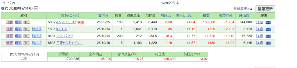 anycolorがダントツで儲かってます。途中評価額が670000円になることもあり、ウハウハしていました。また、保有株数が少ないので影響は全然ないのですが、INPEXの伸び幅がすごいですね。。高市様様です。確かに資源価格高騰してますもんね。後、株主優待を発表していました。確かQUOカードでしたっけ。お遊び程度で買ったので詳しくなく、済みません。。